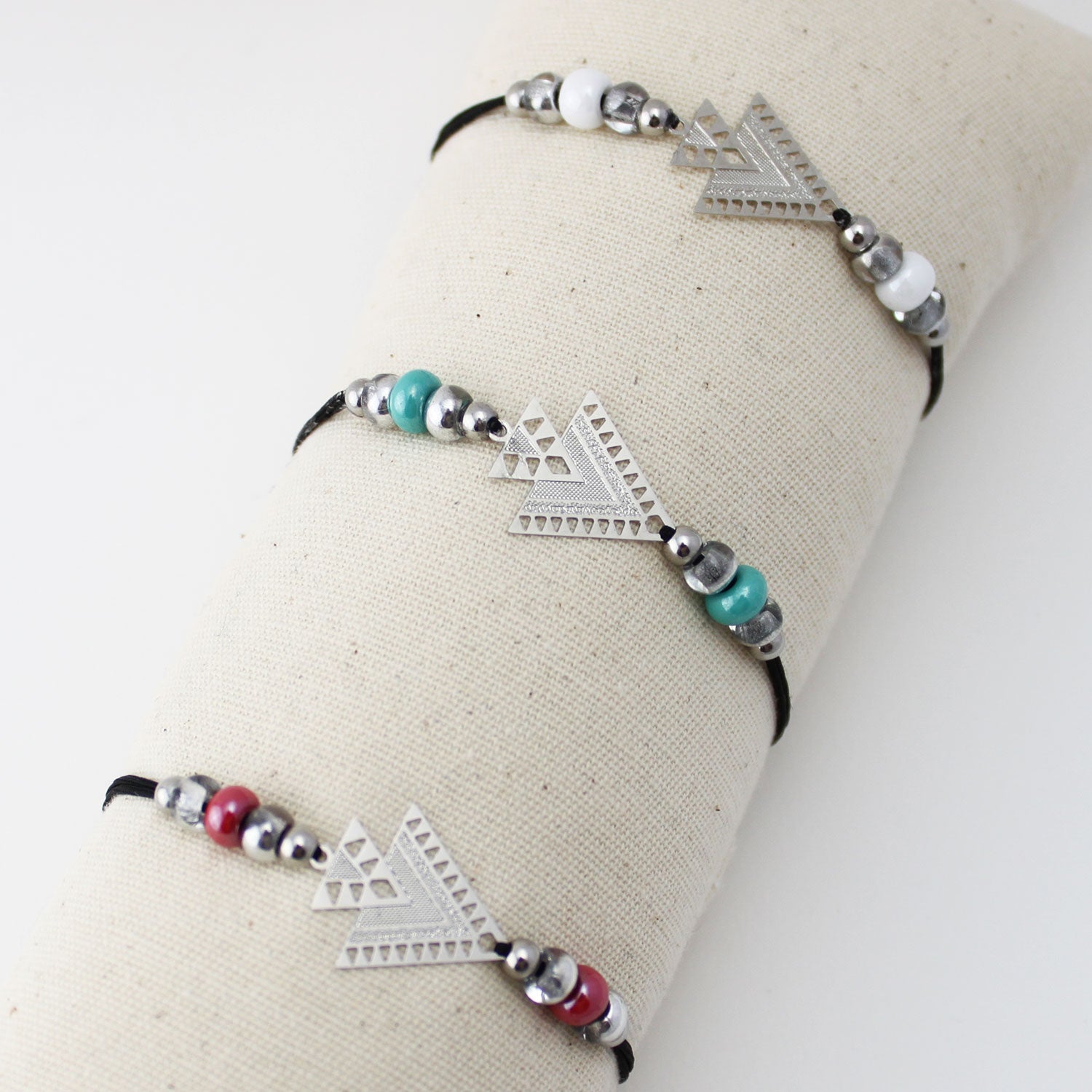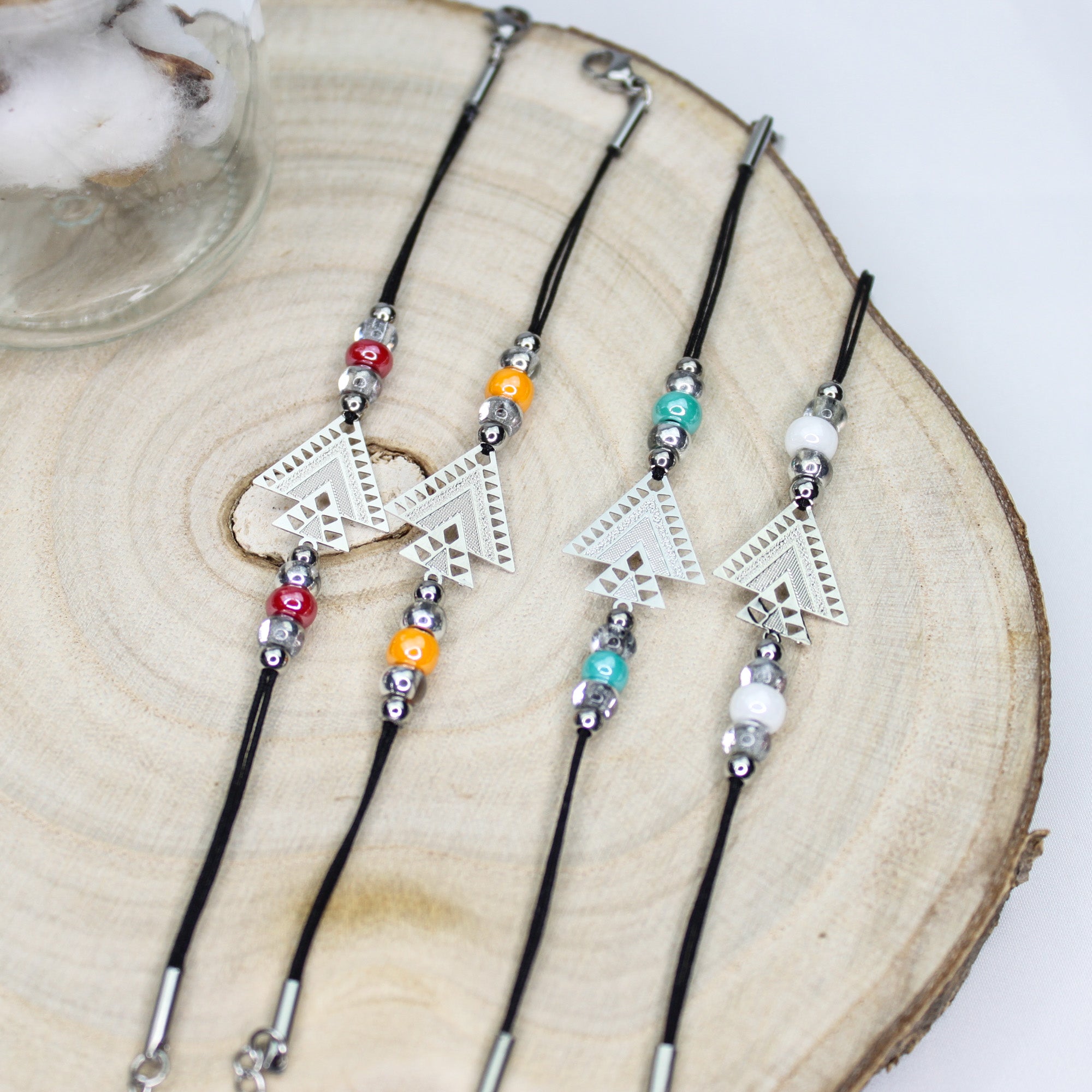 Découvrez le bracelet cordon Kheops, une création unique et raffinée signée Delina Bijoux. Ce bijou fantaisie est composé d’une estampe en laiton reliée à un cordon en nylon tressé, agrémenté de perles de verre argentées aux reflets variés et de perles en acier inoxydable. Le fermoir mousqueton en acier inoxydable et la chaînette d’extension permettent d’ajuster la taille du bracelet pour convenir aux poignets de 15 à 18 cm.